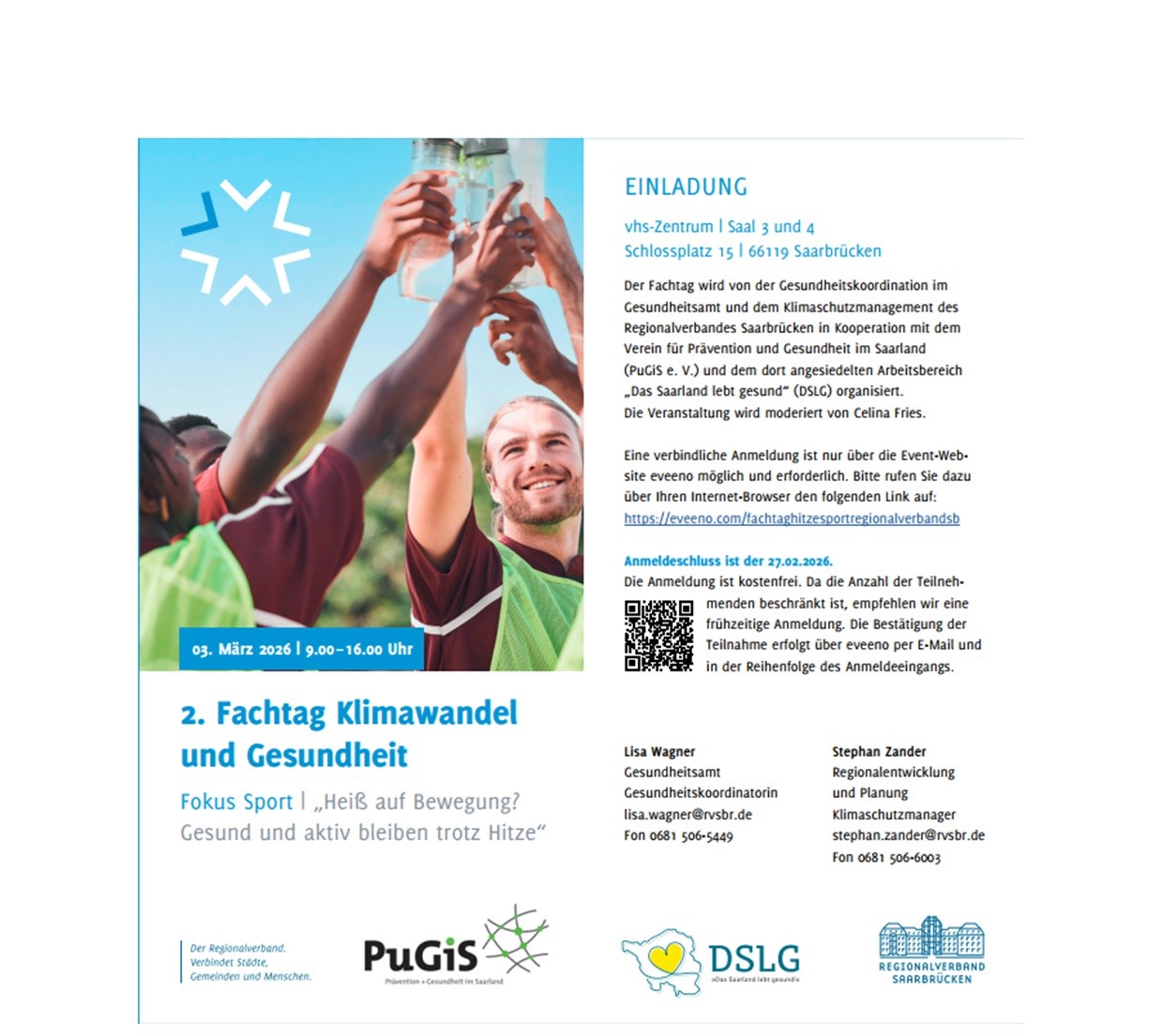 Die Veranstaltung ist kostenfrei. Weitere Informationen zum Tagesablauf und Anmeldung unter: 2. Fachtag Klimawandel und Gesundheit Fokus Sport „Heiß auf Bewegung? Gesund und aktiv bleiben trotz Hitze“